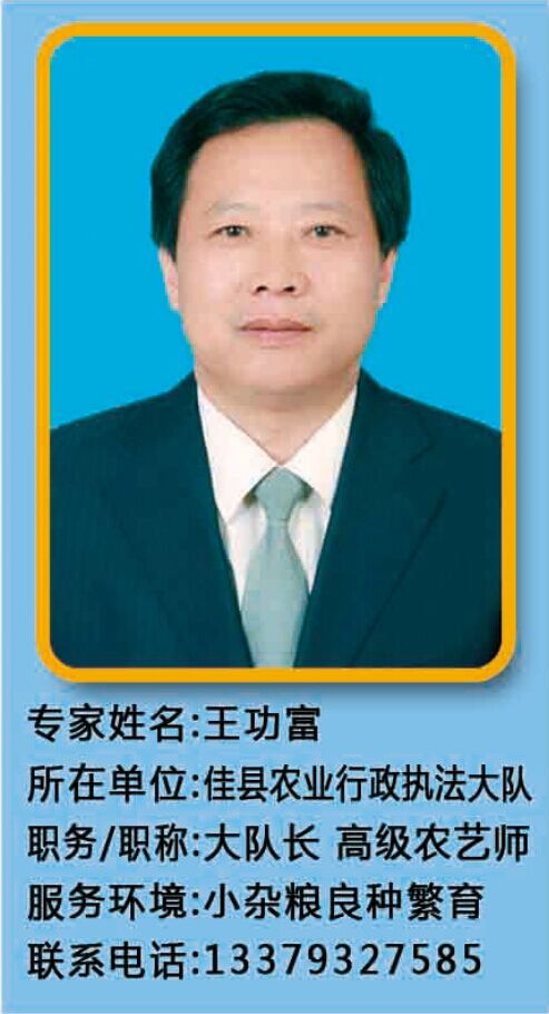 王功富:男,中共黨員,1982年畢業(yè)于榆林農(nóng)校,現(xiàn)任佳縣農(nóng)業(yè)行政綜合執(zhí)法大隊(duì)隊(duì)長(種子管理站站長),高級農(nóng)藝師。