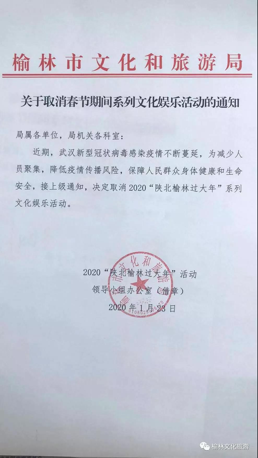 近期,武漢新型冠狀病毒感染疫情不斷蔓延,為減少人員聚集,降低疫情傳播風險,保障人民群眾身體健康和生命安全,接上級通知,決定取消2020“陜北榆林過大年”系列文化娛樂活動。