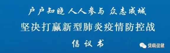 為了有效防控新型冠狀病毒感染肺炎疫情,堅決打贏疫情防控戰,有效保障人民群眾的健康生命安全,根據中省市縣有關文件精神要求,按照縣委、縣政府安排部署,結合佳縣實際,縣委宣傳部聯合縣衛健局,向全縣廣大人民群眾發出如下倡議: